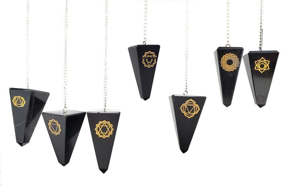 Seven Chakra Symbol Engraved on Black Agate Pendulum ( 7 Pcs )